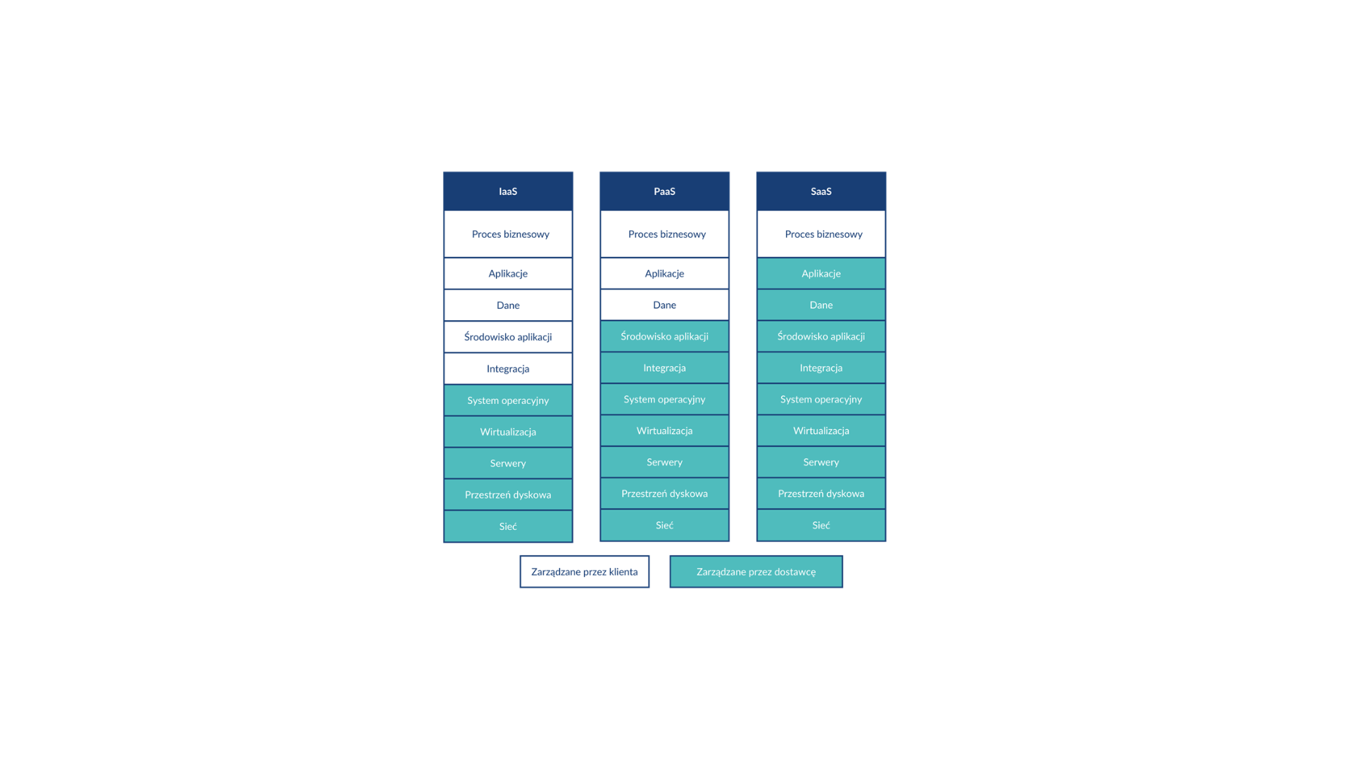 Różnice między tymi trzema modelami zostały opisane w poniższym materiale: https://polcom.com.pl/wiedza/cloud-computing/czym-sie-roznia-saas-paas-iaas/